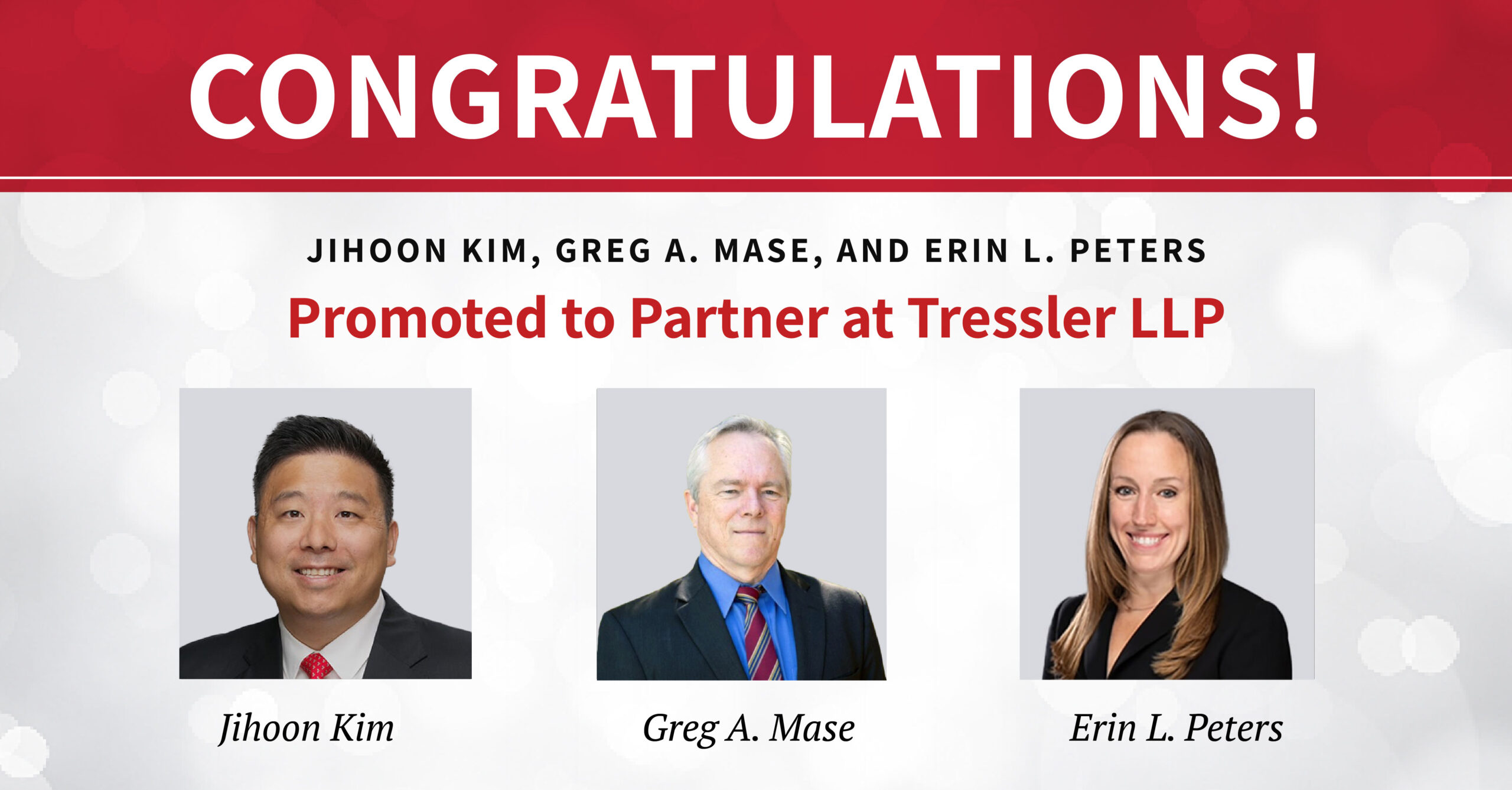 Tressler is pleased to announce that attorneys Jihoon Kim, Greg A. Mase, and Erin L. Peters have been promoted to partner. Jihoon joined Tressler’s Orange County office in 2021 as an associate. Greg joined Tressler’s San Francisco office in 2025, and Erin joined Tressler’s Morristown, New Jersey office in 2024, both as senior counsel. Jihoon is a member of Tressler’s Labor and Employment Practice Group, and Greg and Erin are members of the Litigation Practice Group. Congratulations, Jihoon, Greg, and Erin!