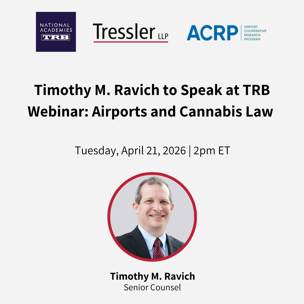 Tressler Attorney Timothy M. Ravich will be speaking on a panel at the National Academies Transportation Research Board’s (TRB) Airport Cooperative Research Program (ACRP) webinar titled “Legal Impacts to Airports from State Legalization of Cannabis.” The event is scheduled for Tuesday, April 21, 2026. This webinar is based on Tim’s recent research published in ACRP Legal Research Digest 49 and will offer insights regarding the legal implications of cannabis legalization on airports. It will address key issues and provide corresponding legal guidance.
